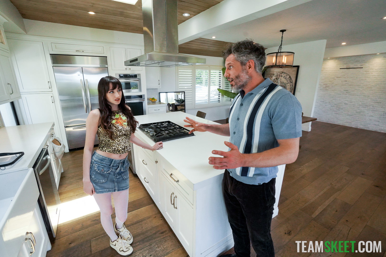 Lana Smalls and Myra Moans, tattooed brunettes with small natural tits, kick off nude on the bed, kneeling to slurp Victor Ray's throbbing big dick together, drooling and gazing up hungrily. They tag-team his shaft, one holding it while the other licks balls. Victor pounds Myra doggy-style, her ass up and pussy spread, while Lana fingers and eats her wet slit from below. Lana rides reverse cowgirl on Victor's massive cock, panties shoved aside, as Myra grinds face-sitting on his tongue. Myra bends over in denim shorts pulled down, vulva exposed for deep thrusts. They kiss sharing his dick, then Victor rails both missionary, legs hoisted high, ending in explosive cum shots on their faces and tits.